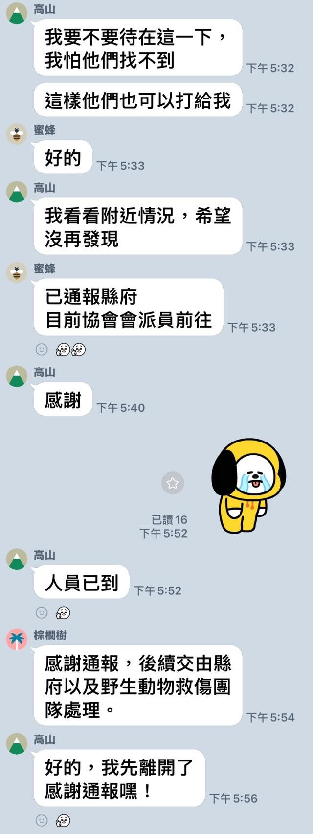 在第一時間,志工依照標準流程完成通報,並將現場狀況回報相關單位,